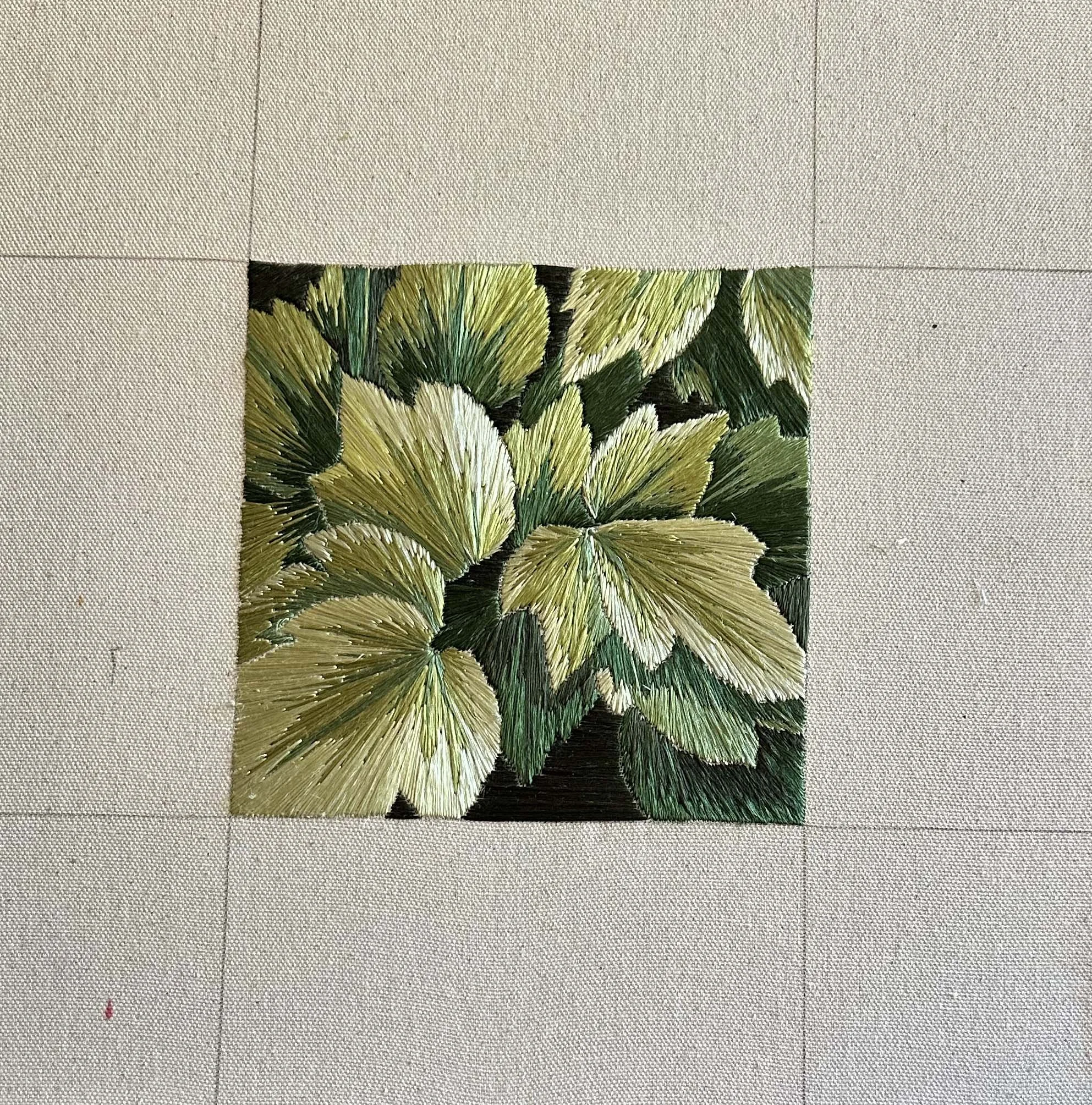 Inspired by the lush summer greens in our blackberry patch. The green gets darker as the layers get deeper, pulling the viewer into an intimate close up. This embroidery uses purely flat silk, with the direction of the stitches directing the direction of the viewer’s eys.